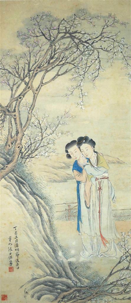 在北京艺术博物馆,一幅长1米多、宽40多厘米的清代设色纸本,生动地描绘了古人清明踏青时的活动。画面中梨花吐蕊,踏青赏春的两位女子在岸边土坡旁流连忘返。其中一人流珠柳簪斜插在发髻间,另一人则右耳边插朵花柳簪。画左下侧落款:丁巳三月清明节后五日。