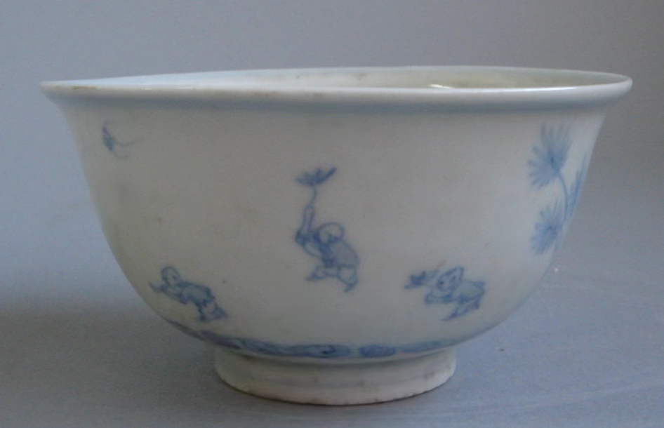 北京艺术博物馆馆藏的一个明万历淡描青花婴戏图碗,碗为鼓腹、撇口、圈足,整体以淡描青花绘制纹饰图案。外壁一周绘婴戏图,其中一个小童手持风筝,快乐地奔跑,一旁其余孩童有的斗草、捕蝶玩得不亦乐乎,生动描绘了儿童活泼、快乐与顽皮的天性;近底部绘卷草纹一周以作装饰。
