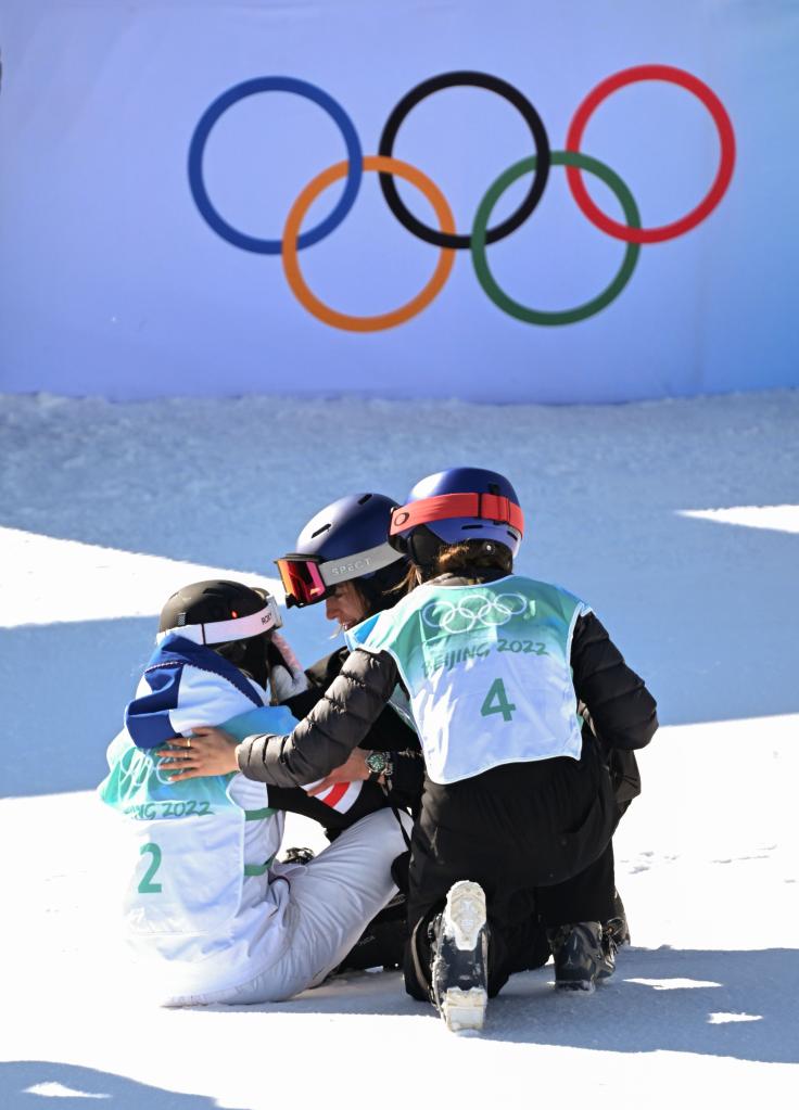 ↑北京冬奥会自由式滑雪女子大跳台决赛后,中国队选手谷爱凌(右)和瑞士队选手玛蒂尔德·格雷莫德(中)安慰法国队选手苔丝·勒德。新华社记者武巍摄