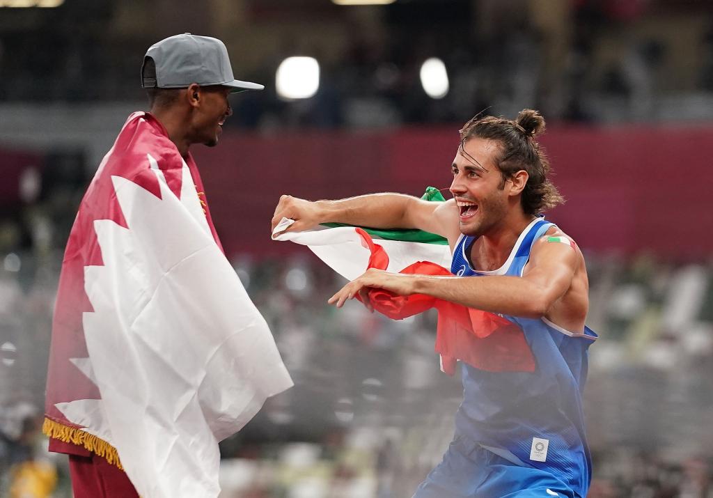 意大利和卡塔尔男子跳高选手并列冠军后久久拥抱