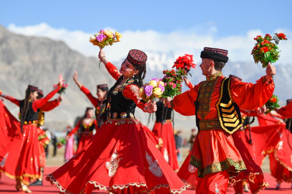 3月21日,在新疆塔什库尔干塔吉克自治县非物质文化遗产展示园,歌舞演员为居民和游客表演节目。