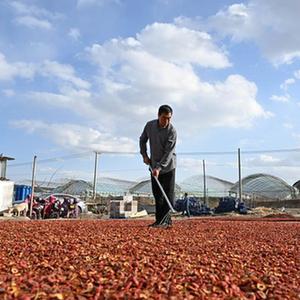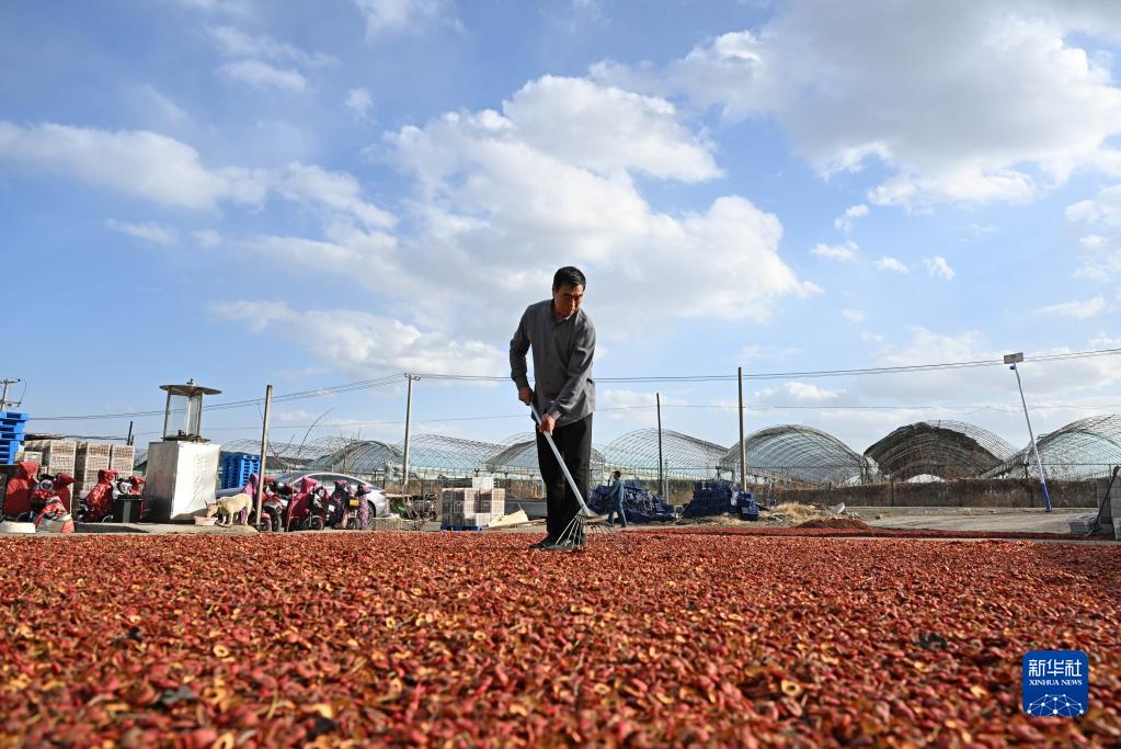4月6日,在天津市蓟州区下营镇野森家庭农场,工人整理晾晒的山楂干。