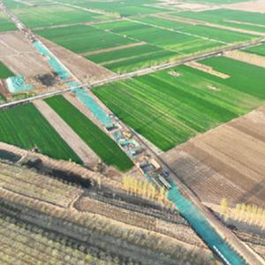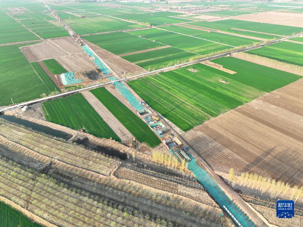4月6日,雄商高铁一线工人在位于河北省任丘市的建设现场施工。