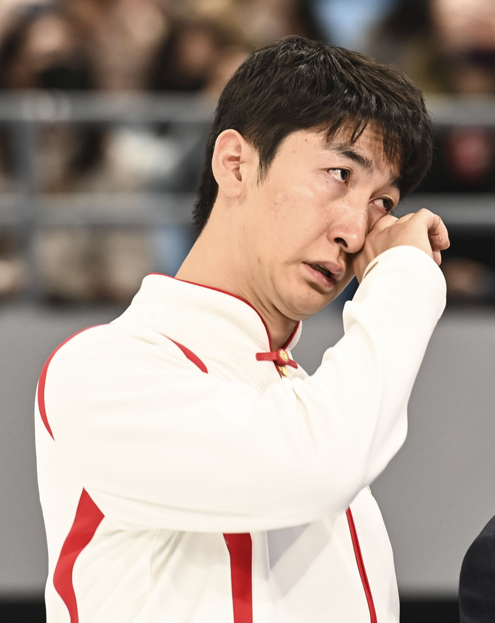 ↓武大靖在颁奖仪式期间擦拭眼泪。新华社记者贺长山摄