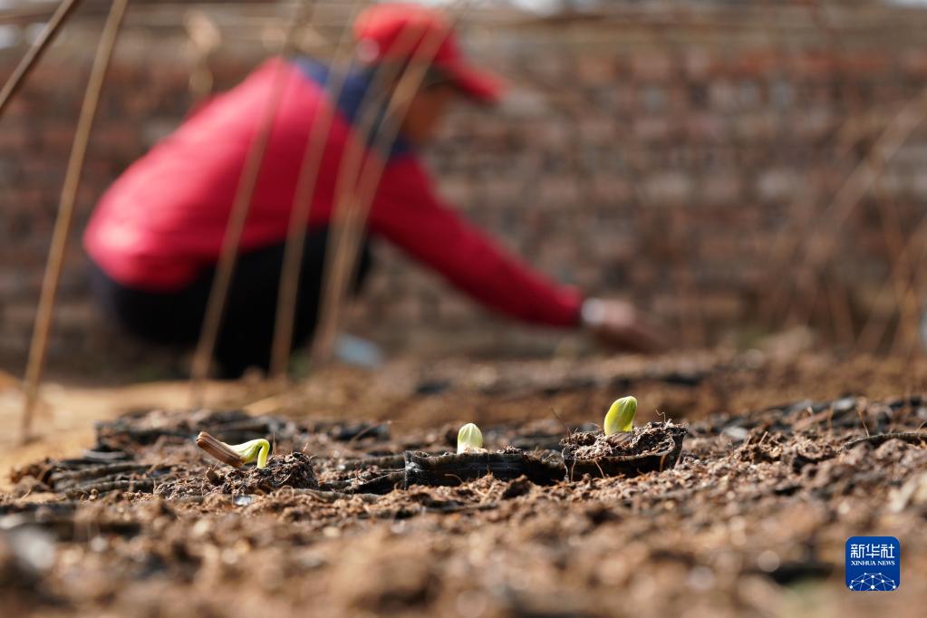 4月7日,邢台市信都区会宁镇张尔庄村村民在管护葫芦苗。