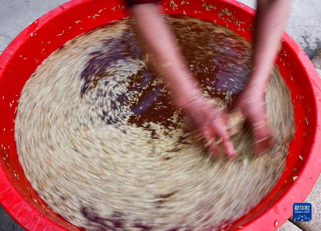 4月6日,贵州省岑巩县水尾镇一杂交水稻种植大户在浸泡稻种,为杂交水稻育苗做准备。