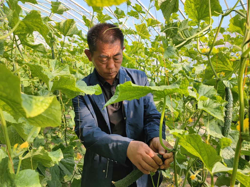 4月1日,新良蔬菜专业合作社负责人马成来在合作社的蔬菜大棚里检查蔬菜长势。新华社记者 张啸诚 摄