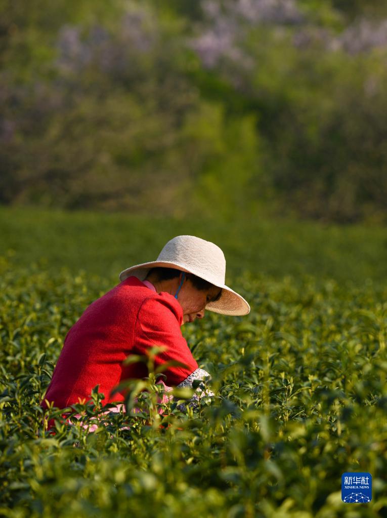 4月8日,采茶工在敬亭山山脚下的一处茶园里采茶。