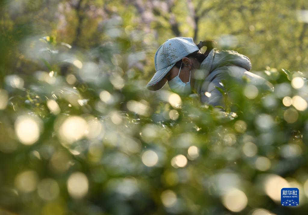 4月8日,采茶工在敬亭山山脚下的一处茶园里采摘茶叶。