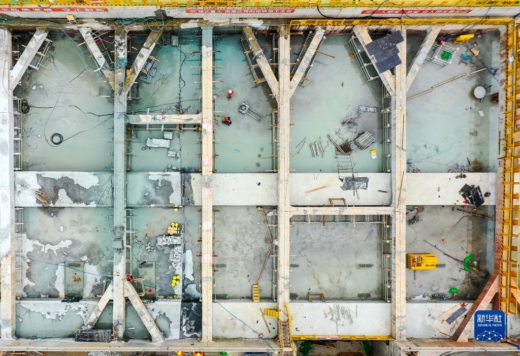 施工人员在广州地铁10号线滨江东路站清理工地(4月8日摄,无人机照片)。