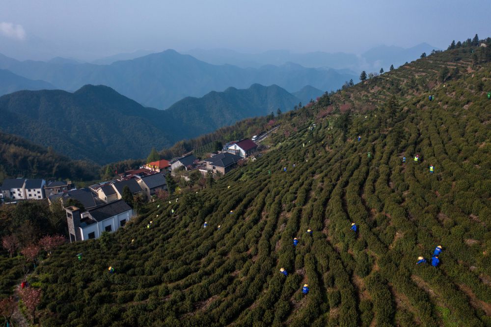2023年4月7日,浙江省杭州市富阳区里山镇安顶村的茶农在采摘安顶云雾茶(无人机照片)。新华社记者 徐昱 摄