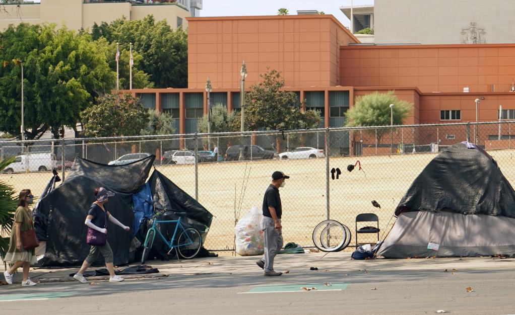 2022年9月8日,人们在美国加利福尼亚州洛杉矶市区经过无家可归者的帐篷。新华社发(曾慧摄)