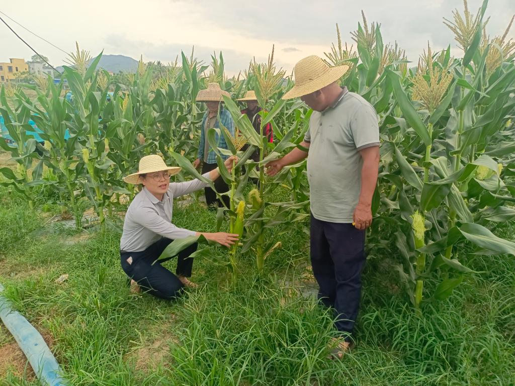 黄丽萍(左一)和村民在村集体产业基地察看玉米长势。新华社记者罗江摄