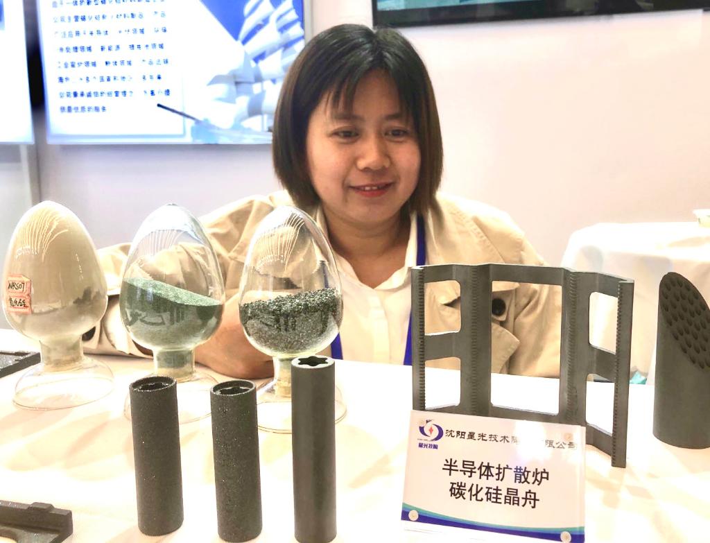 在沈阳星光技术陶瓷有限公司展区,三个玻璃瓶里,装着黑色、暗绿色、棕黄色的粉末状材料,吸引了不少参观者的目光。这些是企业生产的高耐热、耐腐蚀的高性能碳化硅材料制品。