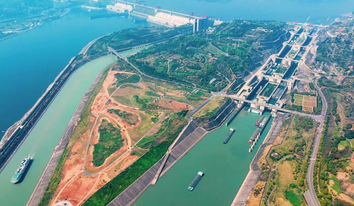 2023年一季度,三峡枢纽航运通过量3989.36万吨,同比增长22.08%,创投运以来一季度航运通过量最高纪录。图为船舶有序通过三峡双线五级船闸和升船机(2023年4月1日摄) 郑家裕摄 / 本刊