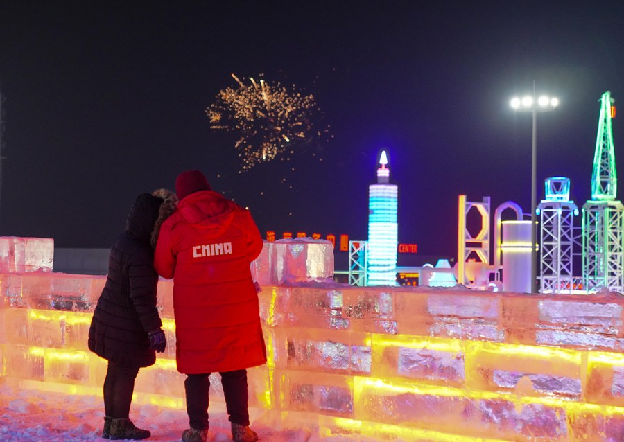 市民在长春冰雪新天地观看烟花。新华社记者 王帆 摄