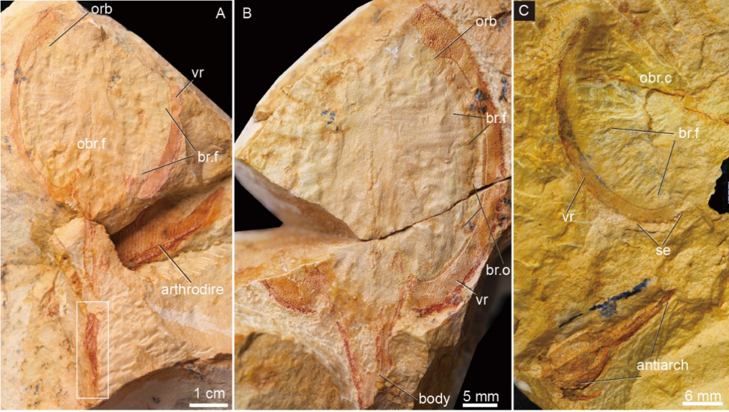 此次发现的九尾狐甲鱼长约10厘米,身体和头甲长度均约5厘米,全身覆盖细小的菱形鳞片,并呈现有规律的、倾斜排列的鳞列。除了拥有盔甲鱼类典型的下歪尾,其尾鳍还具有9个手指状分叉,是原始的叉形尾,上面覆盖有整齐排列的鳞质鳍条,表明鳍条之下有强壮的辐状肌附着。