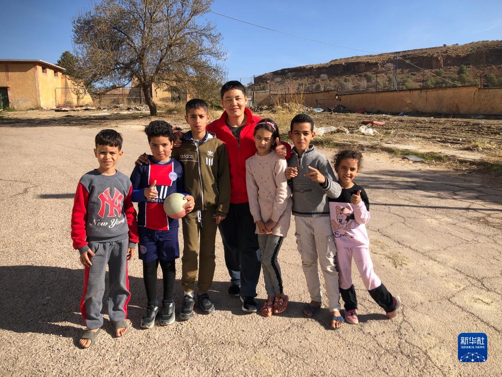 2021年12月21日,在阿尔及利亚赛伊达,中国援阿医疗队妇产科医生程丽(中)与当地小朋友合影(手机照片)。新华社发(中国援阿医疗队供图)