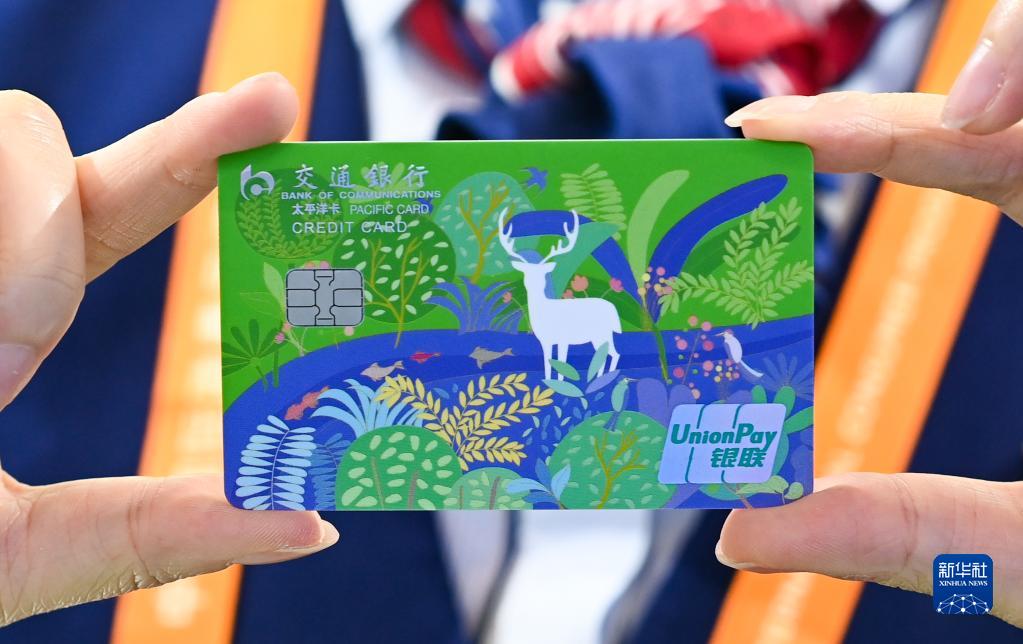 交通银行工作人员展示交通银行绿色低碳主题信用卡,该产品卡面使用了可降解的环保卡基(4月10日摄)。