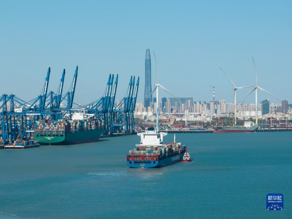 一艘货轮在天津港航道行驶(4月7日摄,无人机照片)。