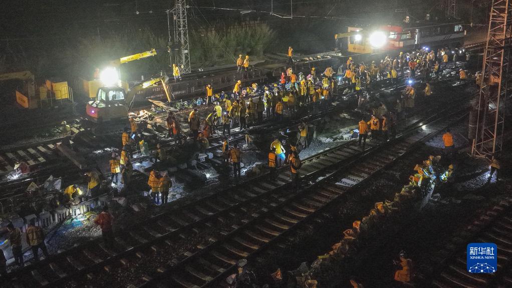 4月12日,广西钦州港站的工人在夜间更换铁轨(无人机照片)。