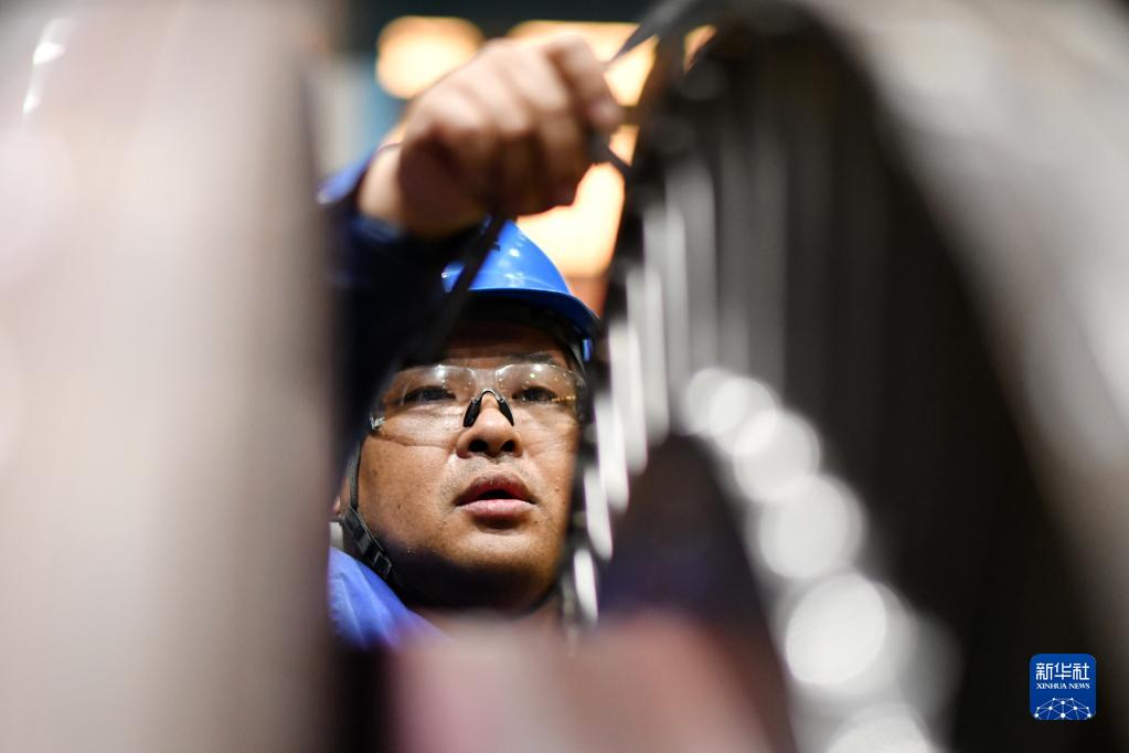 4月10日,工人在哈电集团哈尔滨汽轮机厂有限责任公司车间内生产作业。
