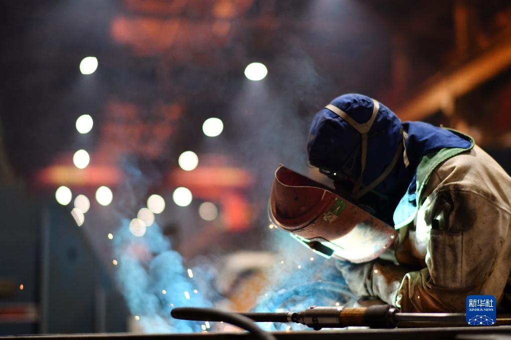 4月11日,工人在哈电集团哈尔滨电机厂有限责任公司车间内生产作业。