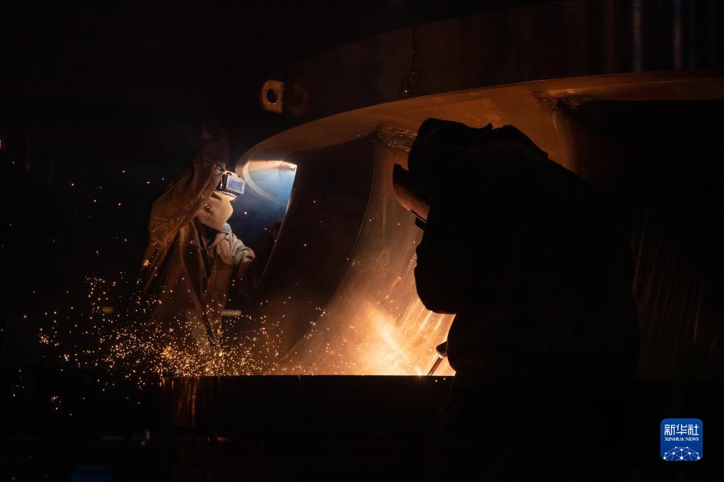 4月11日,工人在哈电集团哈尔滨电机厂有限责任公司生产车间内进行作业。