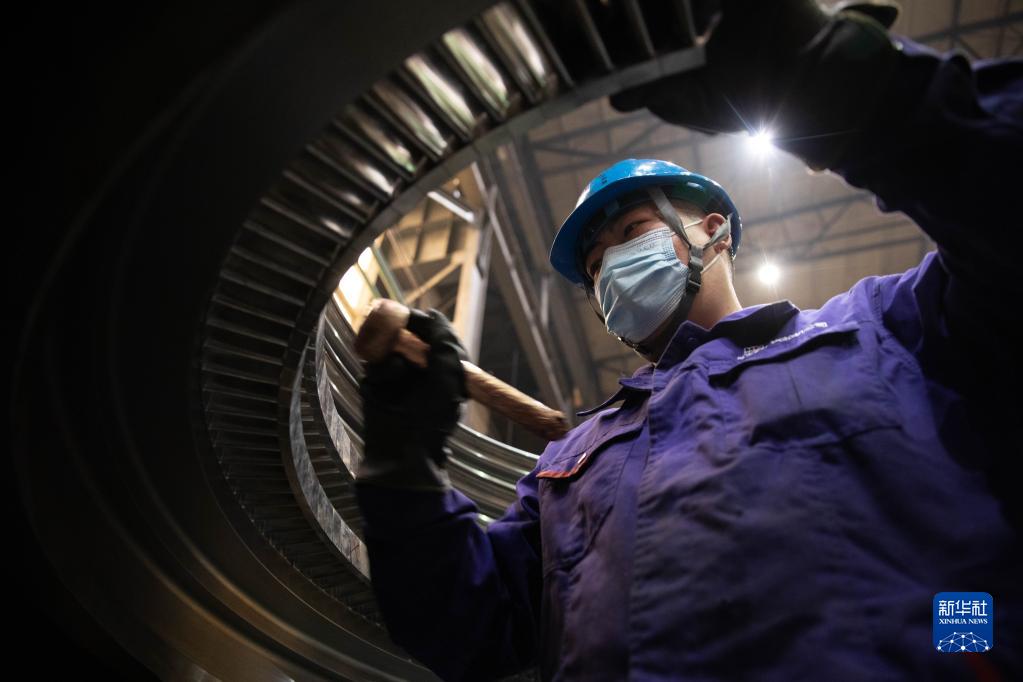4月10日,工人在哈电集团哈尔滨汽轮机厂有限责任公司生产车间内进行作业。
