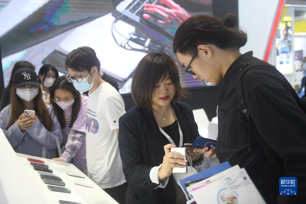 4月12日,参观者在展会上参观选购无线充电宝。