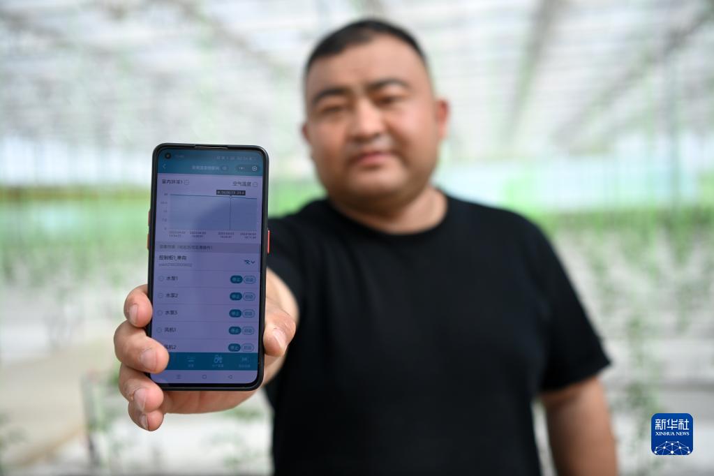 在张掖市甘州区党寨镇陈寨村玻璃智能温室内,工作人员展示手机上的智能温室操控系统(4月10日摄)。