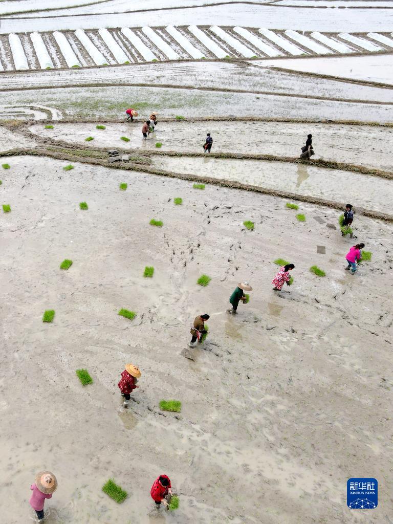 4月12日,农民在湖南省娄底市双峰县井字镇花桥村的田间抛秧(无人机照片)。