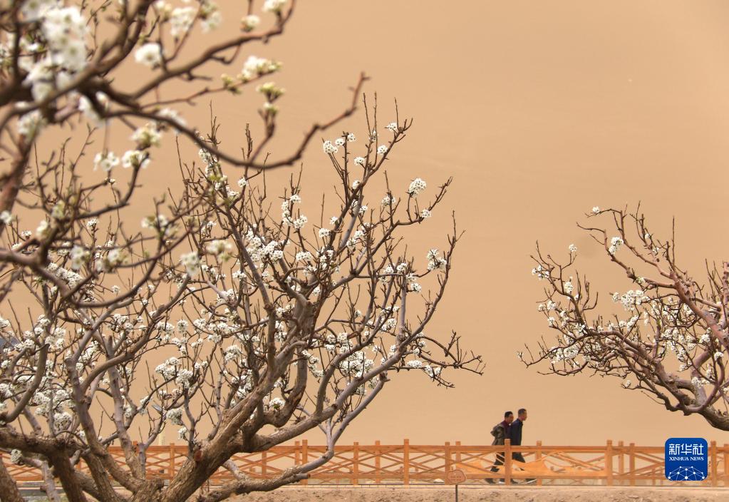 近日,甘肃省敦煌市鸣沙山月牙泉景区内的桃花、梨花、丁香花竞相绽放,别有一番韵味。