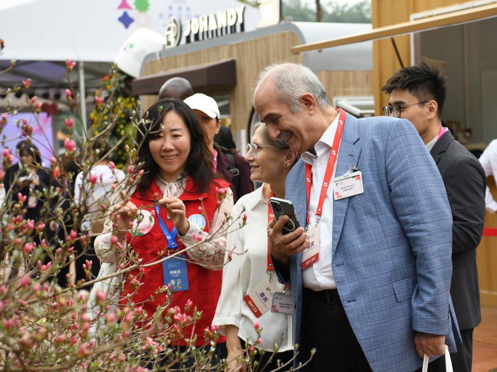 4月8日,中外嘉宾在2023粤港澳大湾区花展现场赏花。新华社记者梁旭 摄