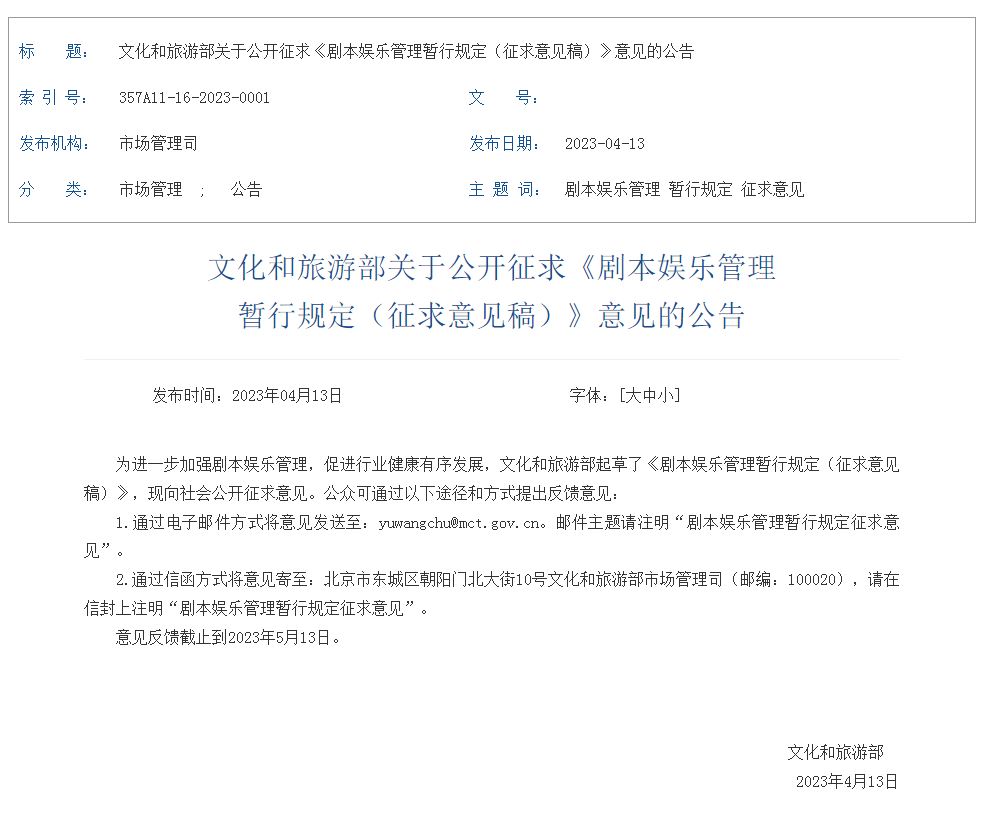 文化和旅游部4月13日发布公告,就《剧本娱乐管理暂行规定(征求意见稿)》公开征求意见。
