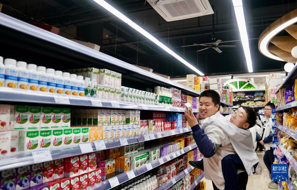 4月12日,朱金祥(左)背着钟华强在学校的超市内选购商品。
