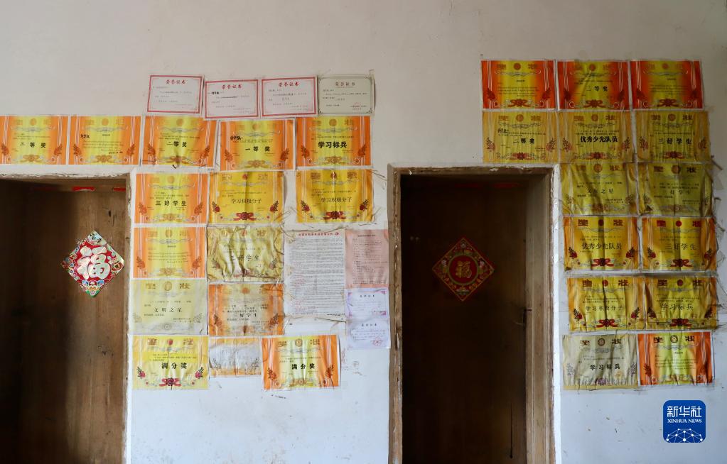 这是钟华强获得的部分荣誉证书,张贴在家中的墙壁上(4月13日摄)。