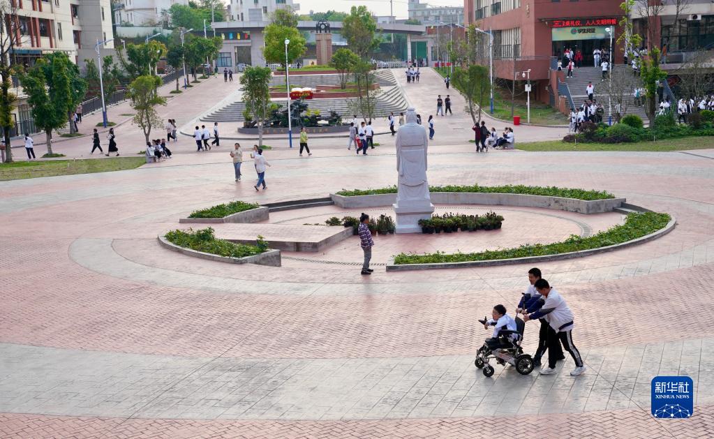 4月12日,朱金祥和同学推着坐在轮椅上的钟华强在校园内散步。