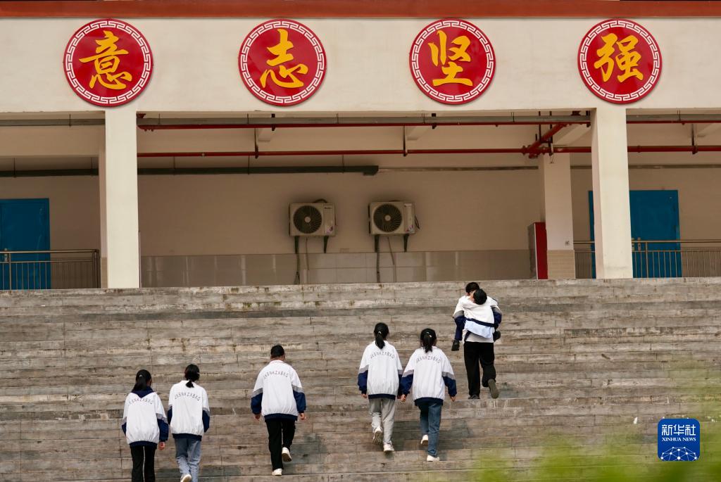 4月13日,朱金祥(右一)背着钟华强返回教室。
