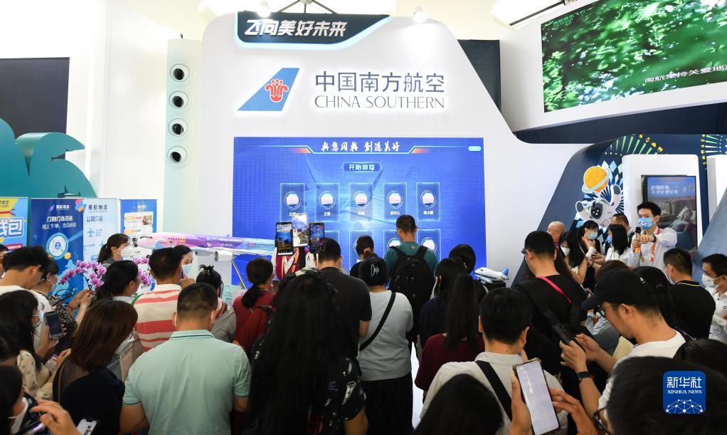 4月14日,观众在中国南方航空展台体验互动游戏。