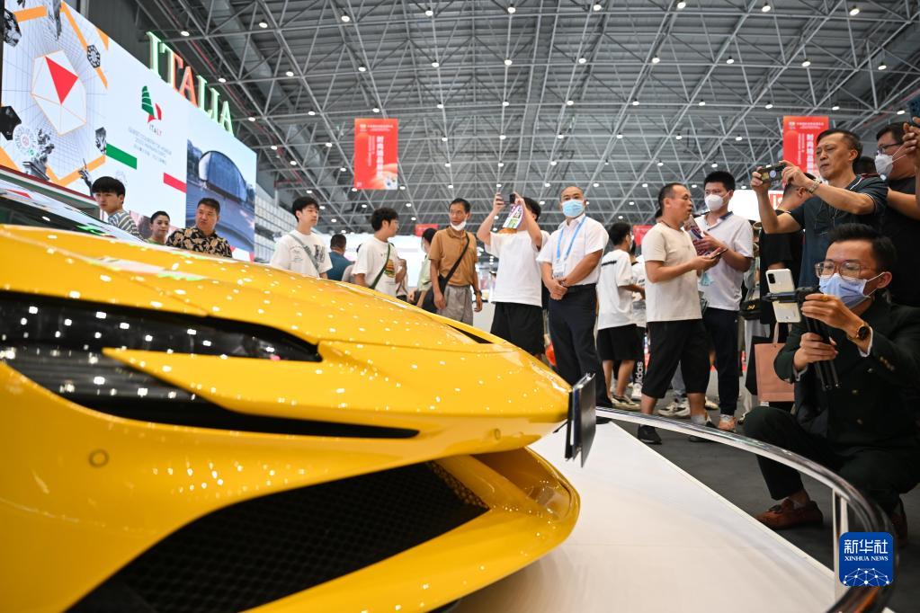 4月14日,观众在消博会现场参观展车。