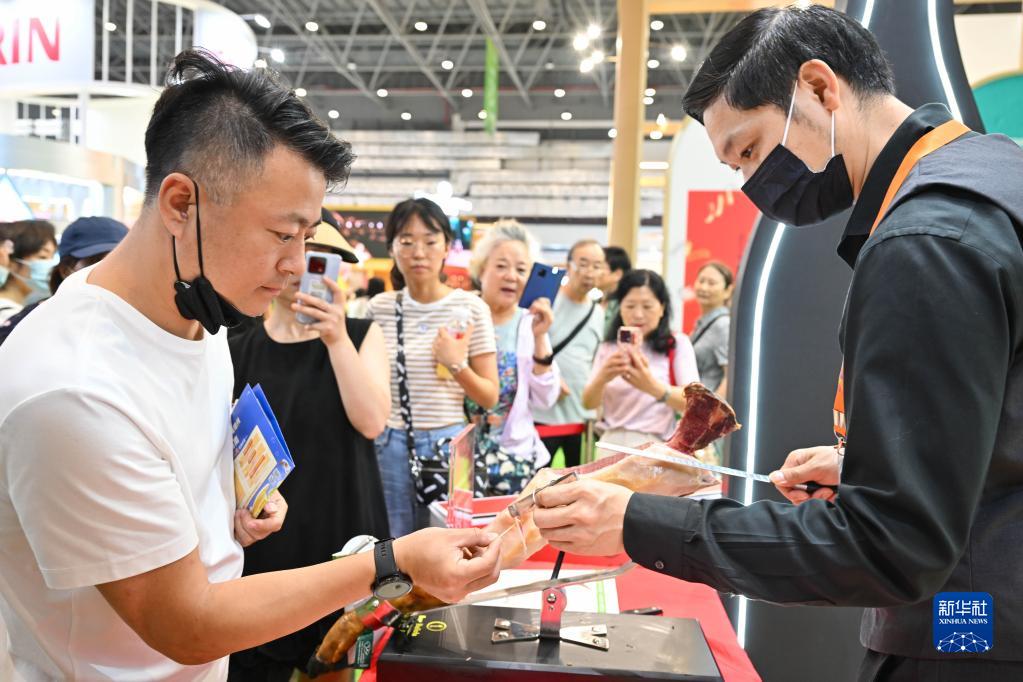 4月14日,观众在消博会现场品尝西班牙火腿。