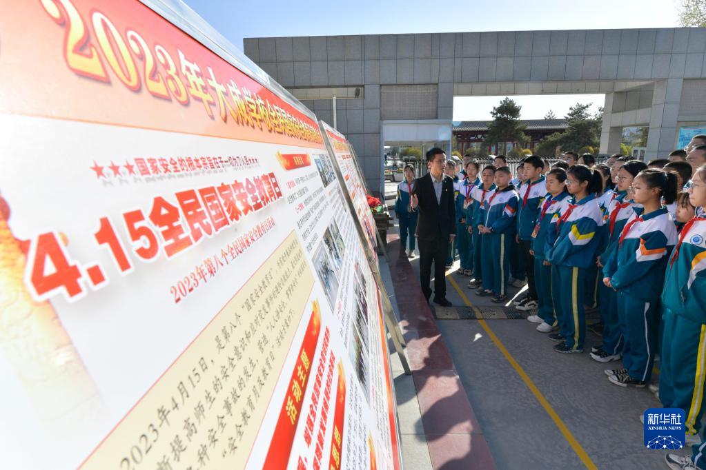 4月14日,在张掖市甘州区大成学校,老师给学生讲解国家安全相关知识。