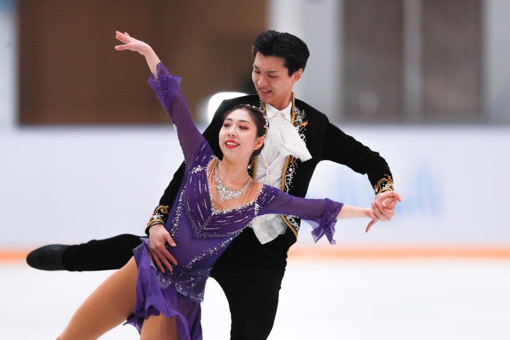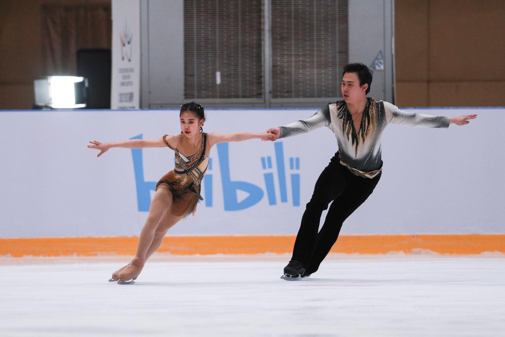 4月13日,陈溪梓(前)/邢珈宁在冰舞自由舞比赛中。新华社记者许雅楠摄