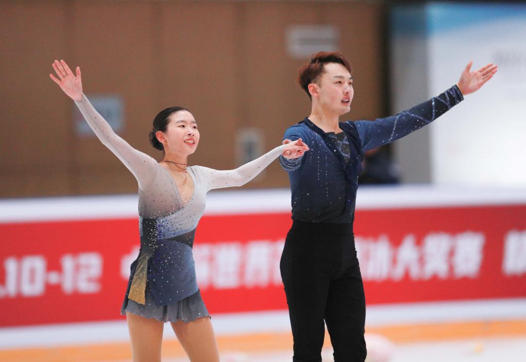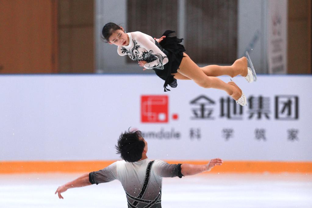 4月13日,黑龙江省冰上训练中心选手赵婉彤(上)/刘宇航在双人滑自由滑比赛中。最终,他们以146.09分的总成绩获得季军。新华社记者许雅楠摄