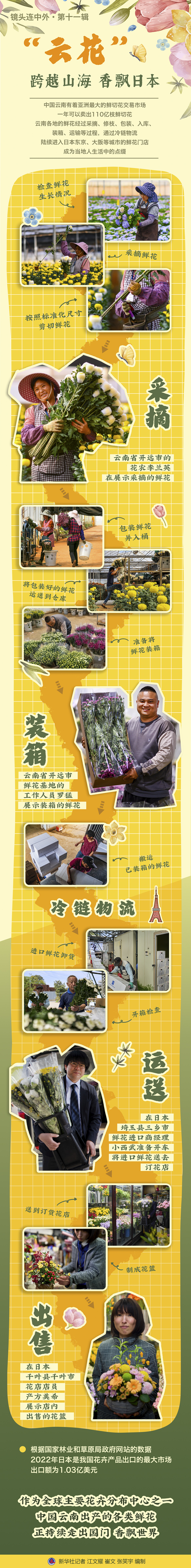 中国云南有着亚洲最大的鲜切花交易市场,一年可以卖出110亿枝鲜切花。春季云南各地的鲜花基地内大量鲜花进入盛花期,各类鲜花经过采摘、修枝、包装、入库、装箱、运输等过程,通过冷链物流,陆续进入日本东京、大阪等城市的鲜花门店,成为当地人生活中的美丽点缀。