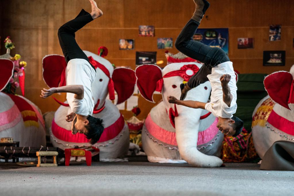 耿马县民族歌舞团演员岩平(左)、宰努思在练功房练习侧空翻。新华社记者 胡超 摄