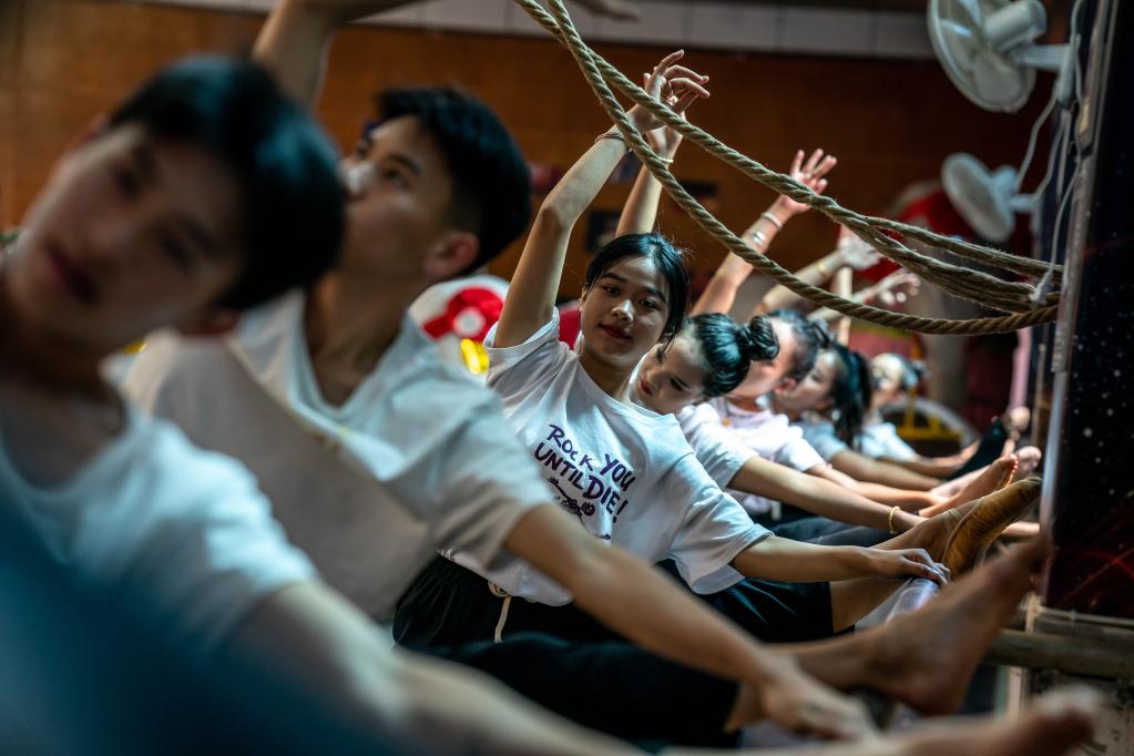耿马县民族歌舞团团长王峰(右下)在和演员们交流舞蹈动作。新华社记者 胡超 摄