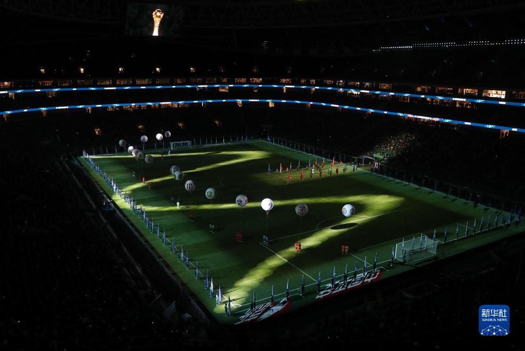 比赛开始前,北京国安功勋教练金志扬与刚刚获得2022中国足球金球奖的张玉宁一起手推划线车,亲手绘制出2023赛季揭幕战赛场的中场线,随后灯光依次点亮整个绿茵场,为新赛季拉开大幕。