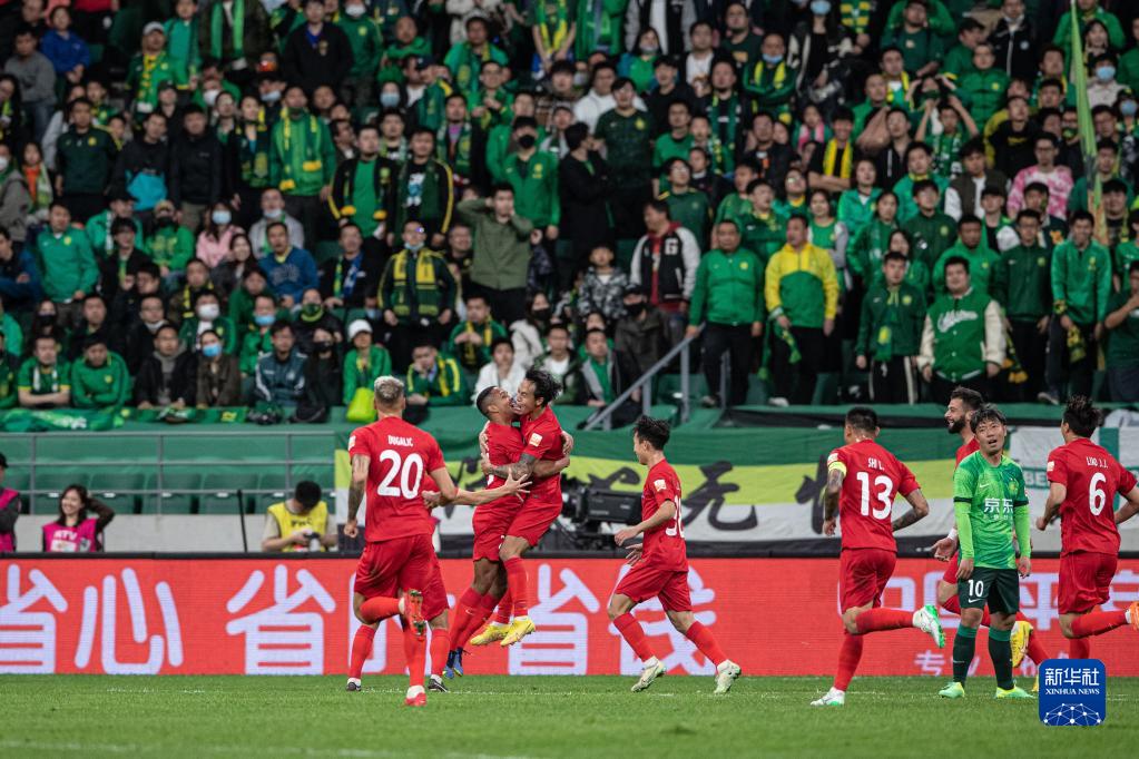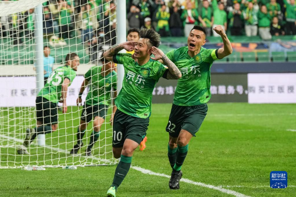 4月15日,北京国安队球员张稀哲(左)在比赛中主罚点球得分后庆祝。新华社记者 彭子洋 摄